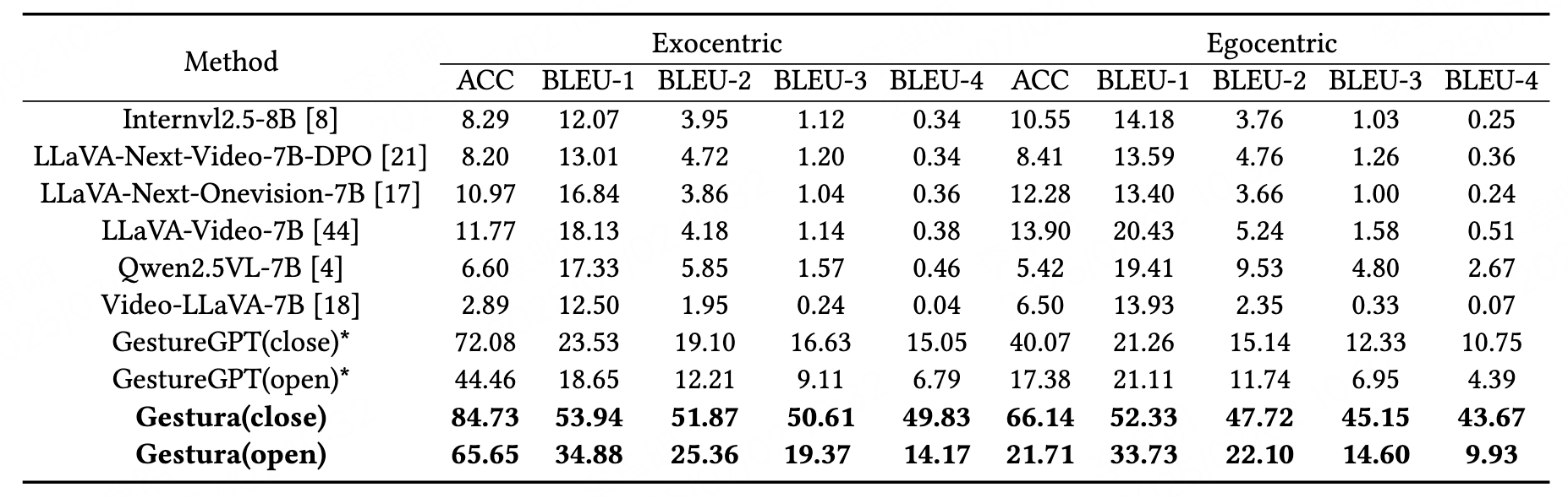 Comparison between our Gestura and the currently state-of-the-art LVLM models on our Test sets of GestureInt dataset. Metrics include BLEU-1∼4 and ACC (where ACC reports both closed-set / open-set results).