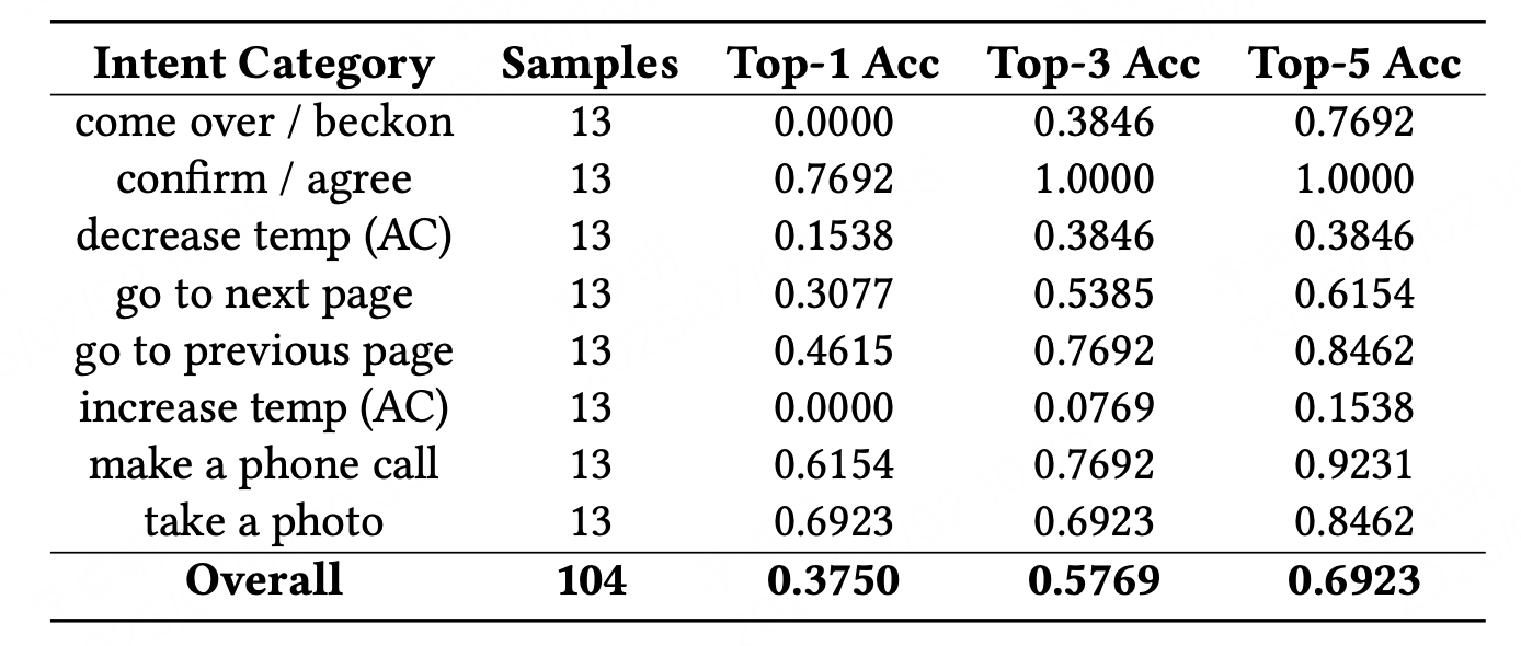 Top-1 / Top-3 / Top-5 accuracy per intent category in an open-world experiment.